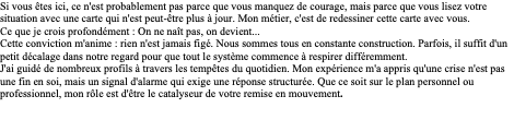 Le changement n'est pas une question de volonté, mais une question de lecture. Si vous êtes ici, ce n'est probablement pas parce que vous manquez de courage, mais parce que vous lisez votre situation avec une carte qui n'est peut-être plus à jour. Mon métier, c'est de redessiner cette carte avec vous. Ce que je crois profondément : On ne naît pas, on devient... C'est cette conviction qui m'anime : rien n'est jamais figé. Nous sommes tous en constante construction. Parfois, il suffit d'un petit décalage dans notre regard pour que tout le système commence à respirer différemment. Je vous propose simplement de faire ce pas de côté, à votre rythme. Plus de 10 ans de pratique J'ai guidé de nombreux profils à travers les tempêtes du quotidien. Mon expérience m'a appris qu'une crise n'est pas une fin en soi, mais un signal d'alarme qui exige une réponse structurée. Que ce soit sur le plan personnel ou professionnel, mon rôle est d'être le catalyseur de votre remise en mouvement.